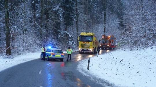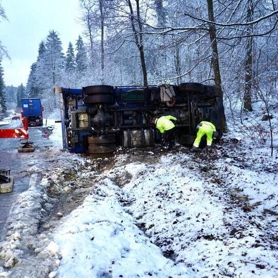 Lastwagen stürzt wegen Eisglätte nahe Heimsheim um
