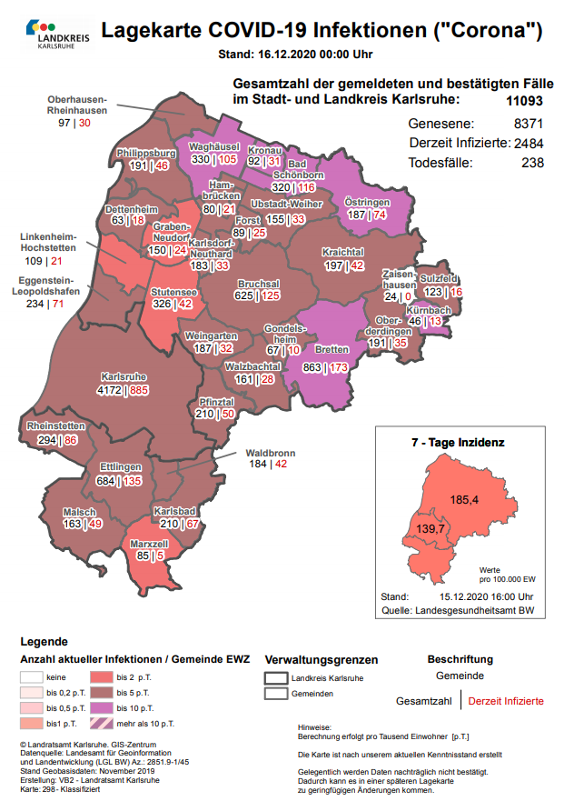 Die 7-Tage-Inzidenz im Stadtgebiet liegt bei 139,7 und damit auch weiterhin deutlich unter dem Landkreis. Dort beträgt der Wert derzeit 185,4 (Stand: 15.12, 16 Uhr).