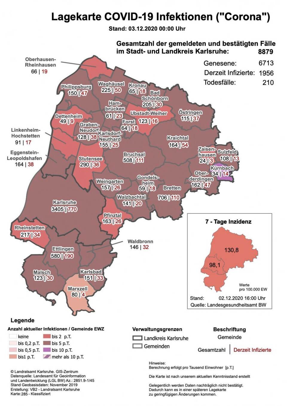 Derzeit gelten 1956 Personen als infiziert. Die Inzidenz für Karlsruhe liegt dem dortigen Gesundheitsamt zufolge bei 98,1, im Landkreis bei 130,8.