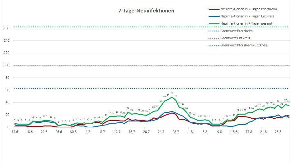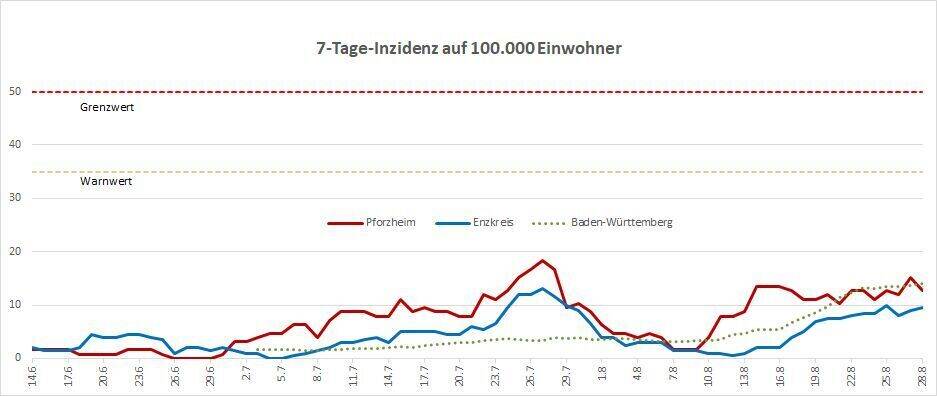 Die sogenannte 7-Tage-Inzidenz liegt am Freitag bei je 12,7 Punkten in Pforzheim und bei 9,5 Punkten im Enzkreis. Vor und drei Wochen lag sie bei 6 Punkten in Stadt- und Landkreis. Der Schwellenwert für Pforzheim liegt bei 63, für den Enzkreis bei 99. Also ist hier alles noch im grünen Bereich, wie auch im Stadt- und Landkreis Karlsruhe sowie im Landkreis Calw. Der Inzidenz-Wert gibt an, wie viele Neuinfektionen es innerhalb der vergangenen sieben Tage pro 100.000 Einwohnern gab. Aber: Hier liegen sowohl Pforzheim als auch der Enzkreis weiterhin unter dem Warnwert von 35 Punkten und unter dem gefährlichen Schwellenwert von 50 Neu-Infektionen pro 100.000 Einwohnern. Wird der Schwellenwert überschritten, können zunächst lokale Gegenmaßnahmen ergriffen und Schutzmaßnahmen gezielt verschärft werden.
