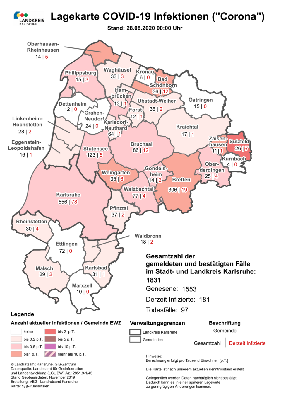 Schlimmer hat es den Stadt- und Landkreis Karlsruhe mit 1831 Corona-Fällen und 1551 Genesenen erwischt. 17 neue Corona-Fälle am Donnerstag, 12 Neu-Infizierte am Freitag – und das bei nur zwei neuen genesenen Personen am Freitag. Das erhöht die Zahl der Akut-Fälle (unter Quarantäne stehende oder im Krankenhaus liegende Personen mit Coronavirus-Infektion) auf 181 Personen. Vor wenigen Tagen lag man da noch weit unter 100 Akut-Fällen.