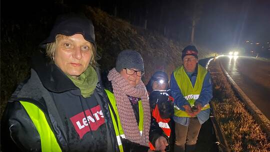 In wechselnder Besetzung sucht die Gruppe momentan jeden Abend mehrere Stunden den Amphibienzaun an der Kreisstraße zwischen Mönsheim und Wimsheim nach Tieren ab.