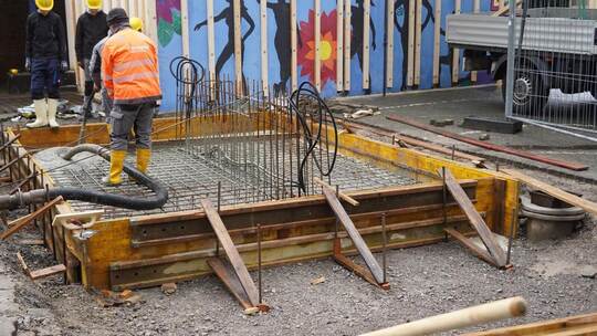 Knöcheltief stehen die Schüler mit ihren Gummistiefeln in dem Beton, den ein großer Laster vor