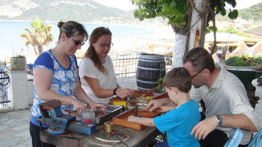 Alexandros Pajatakis blickt über sein altes Goldschmiedsbrett in Richtung Strand und kommt ins Schwärmen. Auf der Terrasse stehen Urlauber und unterhalten sich in Pforzheimer Dialekt. „Das sind immer schöne Begegnungen, und ich freue mich sehr darüber“, schwärmt der in Neuenbürg aufgewachsene Goldschmied vom Besuch aus der Heimat. Viele bleiben spontan, setzen sich ans Brett und gestalten aus Muscheln, Krebsscheren und sogar aus Legosteinen im Sandgussverfahren eigene Schmuckstücke. Alex ist immer wieder erstaunt, welchen Einfallsreichtum seine Gäste an den Tag legen, um ihre eigene schmucke Urlaubserinnerung zu gestalten. Aber dieser Teil seiner Werkstätte ist nicht alles, was den gelernten Goldschmied umtreibt.