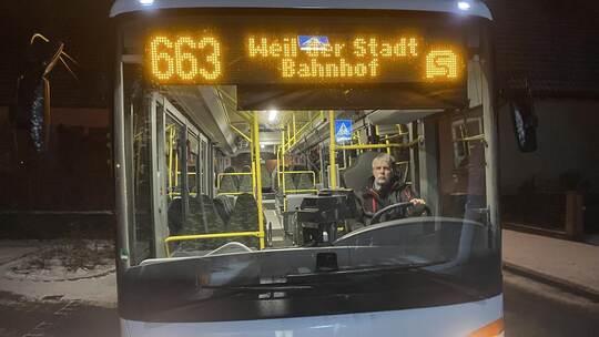 Neuhausen, 5 Uhr morgens. Das Dorf schläft noch. Der Verkehr auch an einem Freitag zwischen Feiertag und Wochenende. Auf den Straßen ist nur ein Räumfahrzeug unterwegs, sorgt dafür, dass der Schnee, der vom Himmel flockt, nicht auf dem Asphalt liegen bleibt. Das freut den Mann am Steuer des Setra-Busses der Linie 663. „Unser Bauhof ist echt auf Zack“, sagt Hartmut Lutz. Das ist auch gut so, denn sonst könnte aus der Jungfernfahrt, die der Neuhausener Gemeinderat unbedingt selbst lenken möchte, leicht eine Rutschpartie werden.