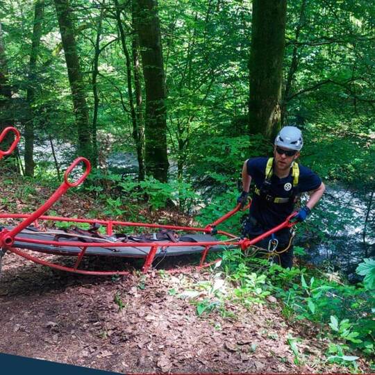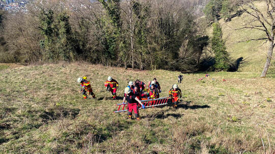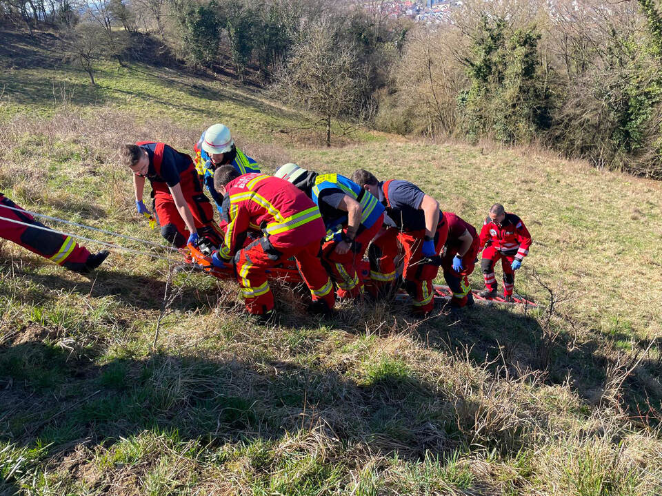 Der Rettungsdienst sei kurze Zeit später mit einem Rettungswagen sowie einem Notarzt, der per Rettungshubschrauber eingeflogen wurde, am Einsatzort eingetroffen. Da sich die Verletzte abseits eines befahrbaren Weges befand, sei die Feuerwehr zur Unterstützung nachalarmiert worden. Nachdem die Frau laut Feuerwehr vom Rettungsdienst stabilisiert worden war, musste sie mit einer Schleifkorbtrage transportiert werden. Der Weg zum Rettungswagen führte über eine teilweise steile Wiese und erstreckte sich über etwa 200 Meter, so die Feuerwehr weiter. An besonders anspruchsvollen Stellen sei daher die Trage mithilfe von Steckleiterteilen und Leinen gesichert hochgezogen worden, um einen sicheren Transport zu gewährleisten.