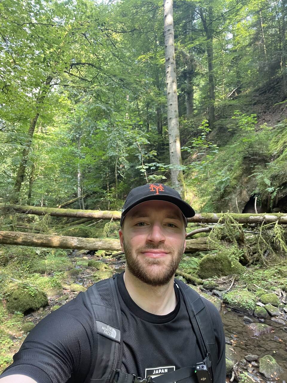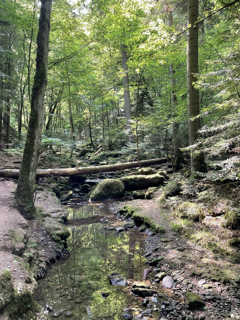 Als Abenteuer geht es für mich schnell weiter, das große Highlight der Wanderung im Blick: die Monbachschlucht. Über schmale Pfade, vorbei an umgestürzten Baumstämmen, moosbewachsenen Felsen und einem Wasserfall, ist dieser Teil des Wegs ein echtes Naturerlebnis. Die rund 350.000 Jahre alte Monbachschlucht genießen an diesem Tag neben mir auch viele andere Wanderer und Familien.