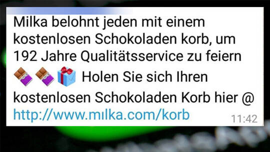 Ein Klick auf mimikama.at (eine Anlaufstelle, um verdächtige Internetinhalte zu melden und Meldungen überprüfen zu lassen) hilft hier weiter. Die Masche läuft so: Folgt der WhatsApp-Nutzer dem Link, wird er zu einer Umfrage weitergeleitet. Nach Beantworten der Fragen soll der Betroffene die Nachricht an mindestens 20 Kontakte weiterschicken. Sonst – man ahnt es – keine Schokolade… Mist! Doch, das kann vorweggenommen werden, einen Naschkorb von Milka gibt es sowieso nicht.