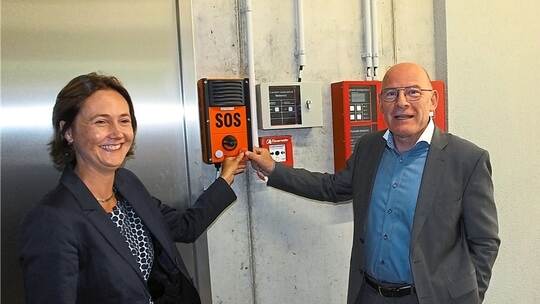 „Die Bilder aus London machen deutlich, wie wichtig Brandschutz ist“, hob Mack hervor, nicht ohne die Begleiterscheinungen der Maßnahme zu vergessen. „Es hat auch Nerven gekostet, aber das Land hat bewiesen, dass es zu seinem Staatsbad steht“, so der Bürgermeister. Über das Ergebnis der Maßnahmen freute sich außerdem Landrat Helmut Riegger. „Auf den ersten Blick ist es viel Geld, doch es wurde zur Sicherheit für alle eingesetzt“, würdigte er das Bekenntnis des Landes dafür. Er warb gleichzeitig aber auch darum, den Straßenbau nicht außer Acht zu lassen. Die unfallfreie Bauzeit von rund 30 Monaten war allen Rednern wichtig, so ging der Dank an Tunnel-Patin Michaela Mack. Während der Verkehrsminister sie kurzerhand in Barbara umbenannte, überreichte die ausführende Firma hingegen eine Statue der Heiligen Babara. Mit dem ersten offiziellen Druck auf den Notknopf aktivierten Michaela Mack und Hermann das System für den Fluchtstollen.