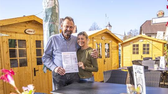 In diesem Jahr soll aber alles anders werden, hoffen die Kaucics. Vom 1. November bis zum 31. Januar 2022 stehen die Holzhütten in der Ortsmitte – dank einer Sondergenehmigung des Gemeinderates. „Die Menschen wollen nach der Biergarten-Saison nicht wieder in die geschlossen Räumlichkeiten hereinkommen“, sagt Lenart Kaucic. Daher habe man sich für die Hüttenlösung entschieden. „Das wird wie ein kleiner Weihnachtsmarkt“, ergänzt Gaby Kaucic. Sechs bis sieben Personen sollen in jeder der Hütten Platz finden, die Reservierung läuft direkt über das „Filou“. Serviert wird im wöchentlichen Wechsel rustikales Essen, wie Gaby Kaucic erklärt.