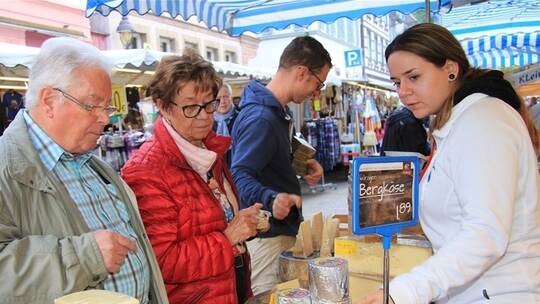 Zwischen 200 und 300 Käsesorten hat der „Käsbär“ Waiblingen im Gepäck, besonders beliebt sind die dreierlei Bergkäse-Arten. „Der Anfang war durch den Regen etwas verzögert“, sagt Mitarbeiter Hendrik Mischko und sorgt für Nachschub am Probiertisch. Doch wenn es so bliebe, könne der Markt nur gut werden. Tatsächlich strömen um die Mittagszeit immer mehr Besucher durch die Gassen – auch Berthold Dittrich mit Frau Jeannette, Töchterchen Viola und Freunden. Die Sechsjährige lässt sich gerade eine Bratwurst schmecken. „Wir sind hier, um die Stadt zu unterstützen“, sagt der Waldrennacher. Etwas zu essen und zu trinken gehöre dazu. Bei dem kulinarischen Angebot der Vereine ist die Versuchung auch groß: Der Frauensingkreis Arnbach serviert zum Beispiel Wildschweintopf, der Bergwerksverein „Knappentopf“ und die Chorgemeinschaft Steakweck und jede Menge hausgemachten Kuchen.