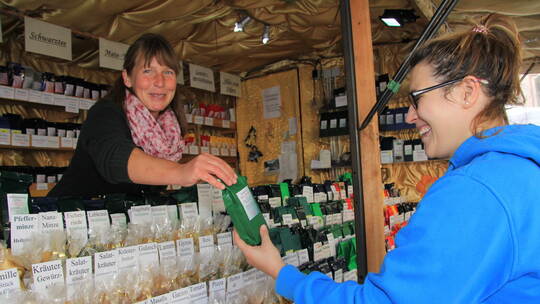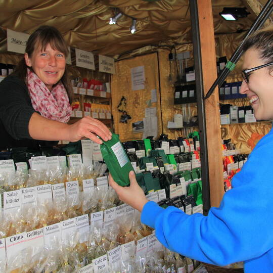 „Ich gehe gerne auf Krämermärkte“, sagt Thomas Gerst aus Knittlingen, der mit Sohn Fabian gerade am Besenstand stöbert. Manche Handfeger sind so weich, dass sie auch kleinere Besucher zum Befühlen einladen. Unweit – und passend dazu – gibt es Brettchen mit der Aufschrift „Kehrwoche“. Deftige Bauernknacker und Dosenwurst sind ebenso zu finden wie Magenbrot, Äpfel, Liköre und Wärmendes von der Schäferei Matyas aus Hausen am Tann. Und wer etwas übers Möhren- und Gurkenschälen wissen will, braucht nur den Vorführungen von Jürgen Agler zuzuschauen. Seit eh und je auf dem Kirchplatz ist das Weißensteiner Gewürzhaus aus Pforzheim. „Ich bin sehr zufrieden“, freut sich Viola Katz-Delić über die vielen Stammkunden. Einer von ihnen ist Hartwig Schütz aus Engelsbrand: „Ich komme jedes Jahr hierher“, schätzt er die Qualität der Tees und Gewürze ohne Geschmacksverstärker.