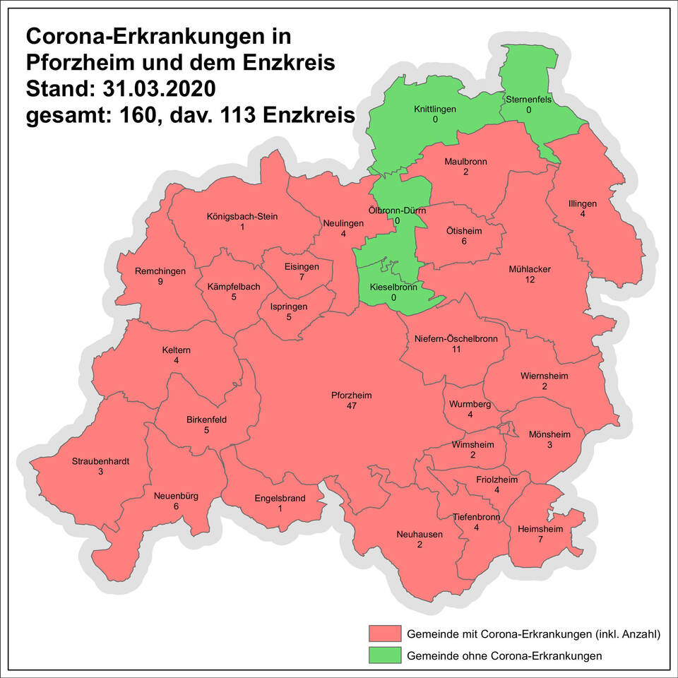 Im Enzkreis gibt es immer noch vier Gemeinden ohne eine bestätigte Coronavirus-Infektion. Das sind Knittlingen, Sternenfels, Ölbronn-Dürrn und Kieselbronn. Seit Dienstag zählt Engelsbrand nicht mehr dazu, denn dort gibt es jetzt den ersten Fall. Die Kommunen mit den meisten Corona-Fällen sind Mühlacker (12 Fälle), Niefern-Öschelbronn (11), Remchingen (9), Eisingen und Heimsheim (je 7).
