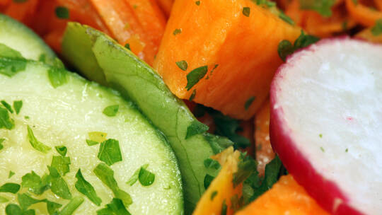 Kartoffeln und Gewürzgurken in Scheiben schneiden. Apfel und Lauchzwiebel putzen und in feine Scheiben schneiden. Eier schälen und in Scheiben schneiden. Die Gewürze im Essig auflösen, mit Öl, Joghurt und der Petersilie verrühren. Alle Zutaten miteinander vermengen und etwas durchziehen lassen.