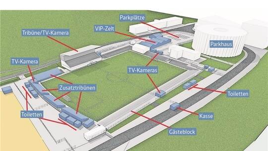 Laut Geiser müssen die Umkleiden „aufgehübscht“, hier und da ein bisschen nachgebessert werden. Den oft als „Acker“ bezeichneten Rasen will der CfR planieren und in Schuss bringen. „Im Fünfmeterraum können wir Rollrasen verlegen“, so der CfR-Vorsitzende. Für das ganze drumherum hat der Architekt schon seit längerem ein professionelles Konzept ausgearbeitet (siehe Bilder). Er rechnet mit 50 000 bis 70 000 Euro, die man in den Holzhof investieren müsse, um es DFB-pokal-tauglich zu machen. Das sei immer noch günstiger als ins Wildparkstadion nach Karlsruhe ausweichen zu müssen, sagt er. „Wir nehmen gerne etwas mehr Geld in die Hand, um gegen Leverkusen in unserem Stadion spielen zu können“, so Geiser. „5000 Zuschauer im Wildparkstadion, da kommt ja keine Stimmung auf.“