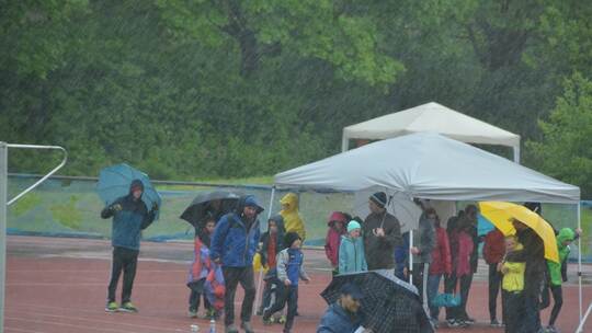 Die von der LG Stein-Eisingen organisierte Veranstaltung auf dem Königsbacher Sportgelände „Plötzer“ wurde am Samstagvormittag witterungsbedingt vorzeitig abgebrochen. Auf der Tartanbahn hatten sich große Pfützen gebildet. Die drei aufgebauten Pavillione wurden vom Wind erfasst und weggeweht. Etliche Athleten meldeten sich aufgrund der Witterung spontan wieder ab und fuhren nach Hause. Nach einer halben Stunde entschloss man sich in Abstimmung mit der Wettkampfaufsicht schweren Herzens zum Abbruch. Zu diesem Zeitpunkt hatte nur ein kleiner Teil der Wettkämpfe stattgefunden. „Wir machen das mittlerweile seit 28 Jahren“, sagte Jürgen Schmitt: „Aber mir denkt es nicht, dass wir jemals hätten abbrechen müssten.“ Zusammen mit seiner Frau Yvonne hatte er die Bahneröffnung federführend organisiert. Den Abbruch der Veranstaltung bedauerten beide sehr, gerade auch mit Blick auf die vielen ehrenamtlichen Helfer. Mehr als 200 Teilnehmer aus knapp 20 Vereinen hatten sich im Vorfeld angemeldet, die meisten Kinder und Jugendliche. Nachgeholt wird die Veranstaltung nicht. Die Ergebnisse der wenigen bis zum Abbruch ausgetragenen Wettkämpfe gibt es im Internet: www.ladv.de.
