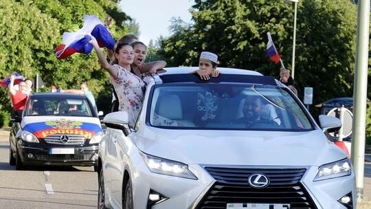Es seien natürlich die jungen Leute, die ihr die Fahnen wie wild abgekauft haben – zu sehen als Wimpel, eingeklemmt unterm Dachhimmel ihres Fahrzeugs oder über die Kühlerhaube gespannt. In einem solchen Auto könnten heute Abend – wenn die „Sbornaja“ die Kroaten niederringt und ins Halbfinale kommt – auch junge Männer wie Waldemar (21) sitzen. Der in Deutschland geborene Sohn von Spätaussiedlern findet nichts dabei, sowohl die deutsche als auch die russische Mannschaft aus vollem Herzen anzufeuern – natürlich beim größten Goldstadt-Public-Viewing, im Enzauenpark.