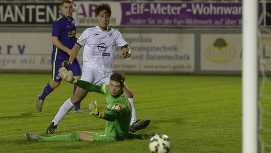 Dominik Salz trifft für den 1. CfR Pforzheim gegen den FC Nöttingen.