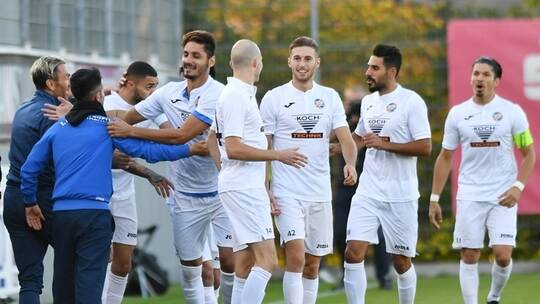 Selten trafen sich die CfR-Spieler bislang in dieser Saison zum Torjubel – und wenn, war häufig Bodgan Cristescu (Vierter von rechts) wie hier beim Spiel in Nöttingen verantwortlich. Foto: Hennrich