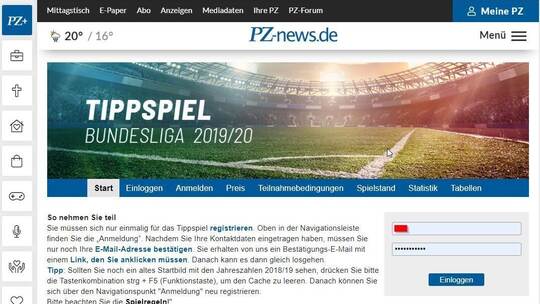 ABER: Sie müssen sich auf https://tippspiel.pz-news.de mit neuem Spielernamen und neuem Passwort anmelden. Aus Datenschutzgründen können Sie Ihre alten Tippspieldaten leider nicht mehr benützen. Also nicht gleich einloggen, sondern neu anmelden/registrieren.