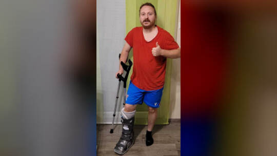 Mit Spezialschuh und Krücken: Sören Melzig vom FSV Eisingen ist nach seinen Operationen am Wadenbein wieder zu Hause. Foto: Melzig