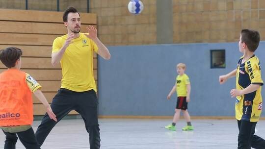 Geduldig beteiligte sich Patrick Groetzki zwei Stunden lang am Training, gab Tipps und zeigte ein paar Tricks. Nach dem Training wurde es dann noch einmal aufregend für die jungen Handballer. Patrick Groetzki gab fleißig Autogramme – auf Trikots, T-Shirts, Schuhe, Handyhüllen und vieles mehr und ließ sich bereitwillig fotografieren. Dann wurde er mit Fragen gelöchert.