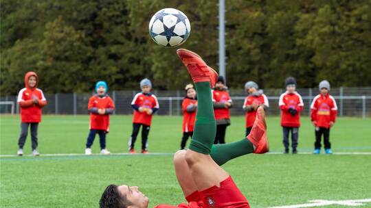 Was ist denn hier los? Viele Fußballer trauten vergangene Woche ihren Augen nicht. Auf dem Kunstrasenplatz des 1. FC Birkenfeld zauberte Ronaldo mit dem runden Leder ein Kunststückchen nach dem anderen. Kopf, Knie, Fuß, Hacke – natürlich dürfte der Ronaldo-typische „Siii“-Jubel nicht fehlen. Der portugiesische Superstar zeigte alles, was er drauf hat und erhielt dafür kräftig Beifall. Um ihn herum standen die Birkenfelder Nachwuchskicker. Mit großen Augen verfolgten sie den Auftritt des Europameisters. Sie waren hin und weg.