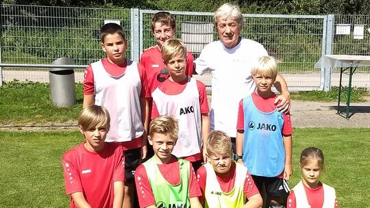 Tricks und Tore: Ex-Weltmeister um Frank Mill zeigen jungen Kickern in Huchenfeld, wie es geht