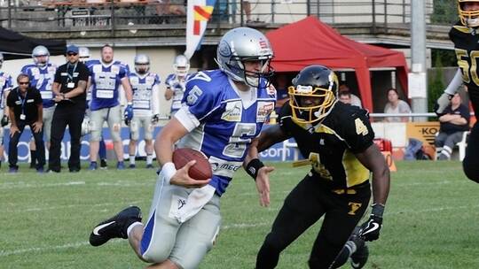 In den letzten beiden Spielviertel ging es hin und her. Quarterback Chris Treister sorgte dann für die letzten Punkte des Tages. Nach angetäuschter Ballübergabe nahm er selbst den Weg durch die Mitte zum 22:15-Endstand im Holzhof.
