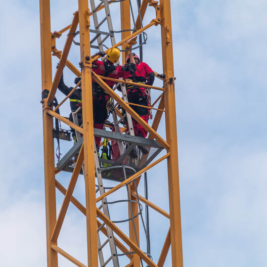 Person auf 40 Meter hohem Baukran hält Karlsruhe in Atem