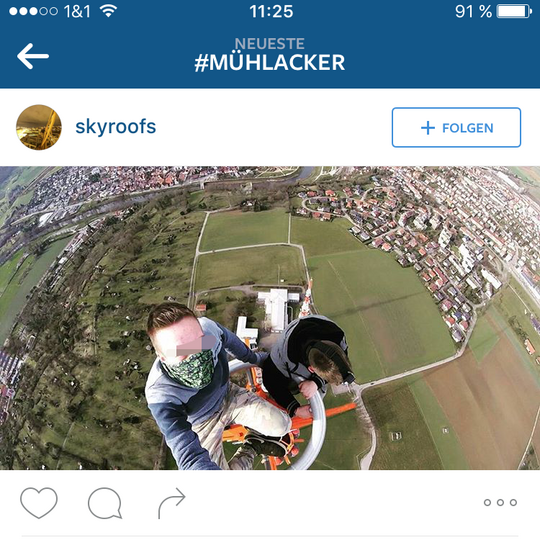 Zwei junge Männer klettern auf Mühlacker Sender