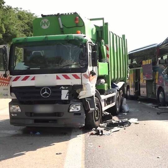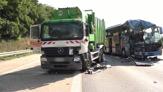 A5 bei Ettlingen: Reisebus knallt auf Müll-Auto