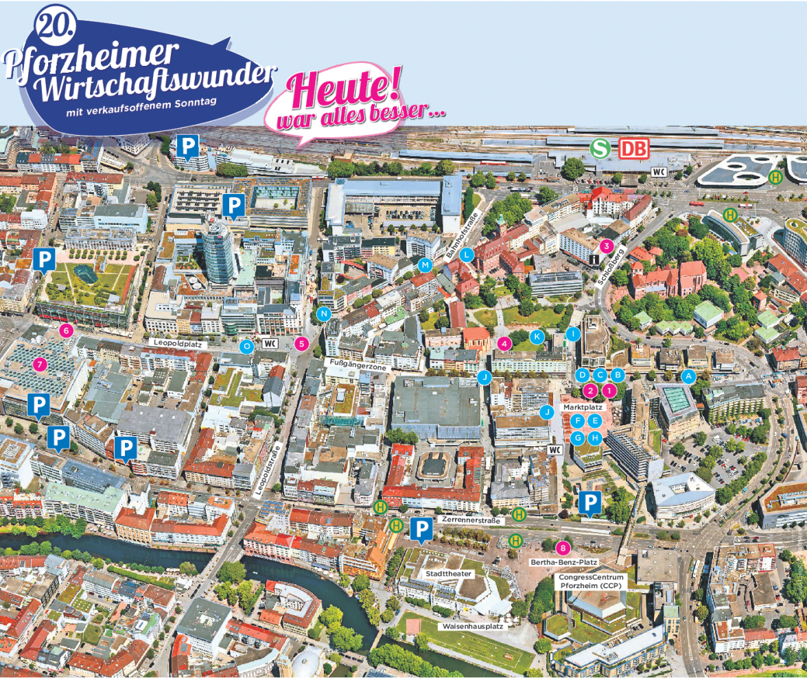Allphaville, Bülent Ceylan oder das Phantom der Oper: Das Congress-Centrum Pforzheim (CCP) stellt am gemeinsamen Infostand mit dem WSP und den Schlossberghöfen die Veranstaltungs-Highlights 2024 und 2025 vor. Hier auf dem Marktplatz gibt es auch die Foto-Rampe für die Oldtimer. Auf alle Interessierten warten ein tolles Gewinnspiel, eine Mitmachaktion und sogar kleine Goldschätze. Darüber hinaus gibt es hier die Wirtschaftwunder-Pins, die kostenlose Wirtschaftwunder-Einkaufstasche sowie Infos rund um den Eigenbetrieb Wirtschaft und Stadtmarketing Pforzheim (WSP). Mit den „Schlossberghöfen Pforzheim“ entsteht direkt im Anschluss an die östliche Fußgängerzone ein neues Quartier zum Leben, Arbeiten und Wohnen. Aktuelle Pläne und Visualisierungen informieren über das Bauvorhaben und zeigen, wie dieser Teil der Innenstadt zukünftig gestaltet und genutzt wird. Für die Kleinen gibt es direkt am Infostand eine Sandbaustelle mit Baggern und weiteren Spielgeräten.