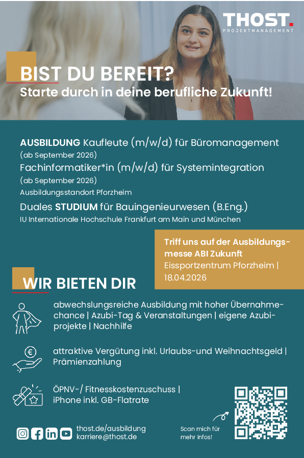 Auch praktisch leisten Eltern einen wichtigen Beitrag: Sie unterstützen bei der Suche nach Praktika oder Ausbildungsplätzen, helfen bei Bewerbungsunterlagen oder nutzen eigene Netzwerke. Gleichzeitig ist es entscheidend, dass Eltern nicht entscheiden, sondern begleiten – damit junge Menschen Verantwortung für ihren eigenen Berufsweg übernehmen. Alle die sich rund um die Themen Studium und Beruf, Auslandsaufenthalte, Freiwilliges Soziales Jahr informieren oder beraten lassen möchten, können von der Abi Zukunft Pforzheim 2026 profitieren.
