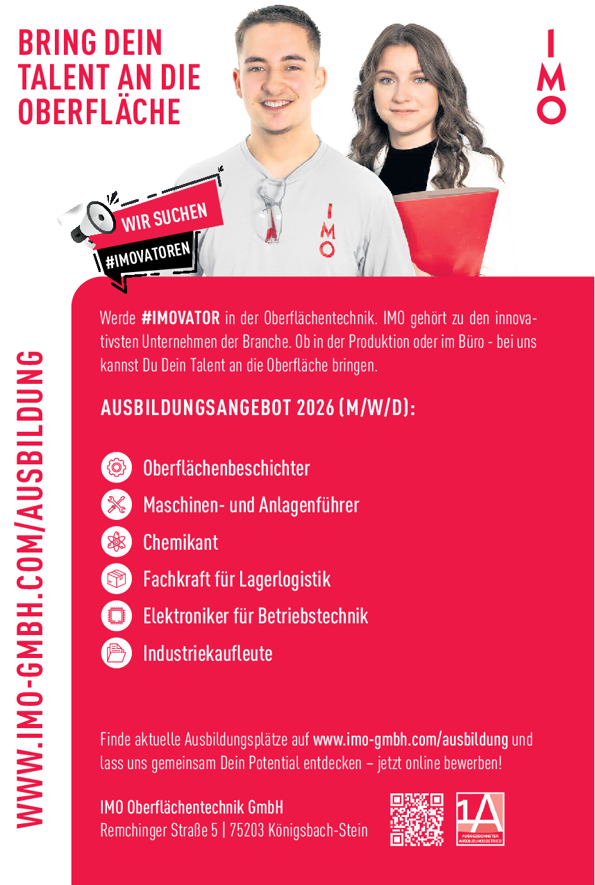 Galvanisierte, also beschichtete Teile, kommen nicht nur in Autos, sondern auch in Smartphones oder anderen Elektrogeräten zum Einsatz. Sie sind aus unserem Alltag nicht wegzudenken, sodass der Beruf des Oberflächenbeschichters auch in der Zukunft eine große Rolle spielen wird. Nach erfolgreichem Abschluss der Ausbildung kann ich bei IMO bleiben und auch eine Weiterbildung zum Galvanotechniker sowie zum Galvanomeister machen – oder auch Umwelttechniker werden.