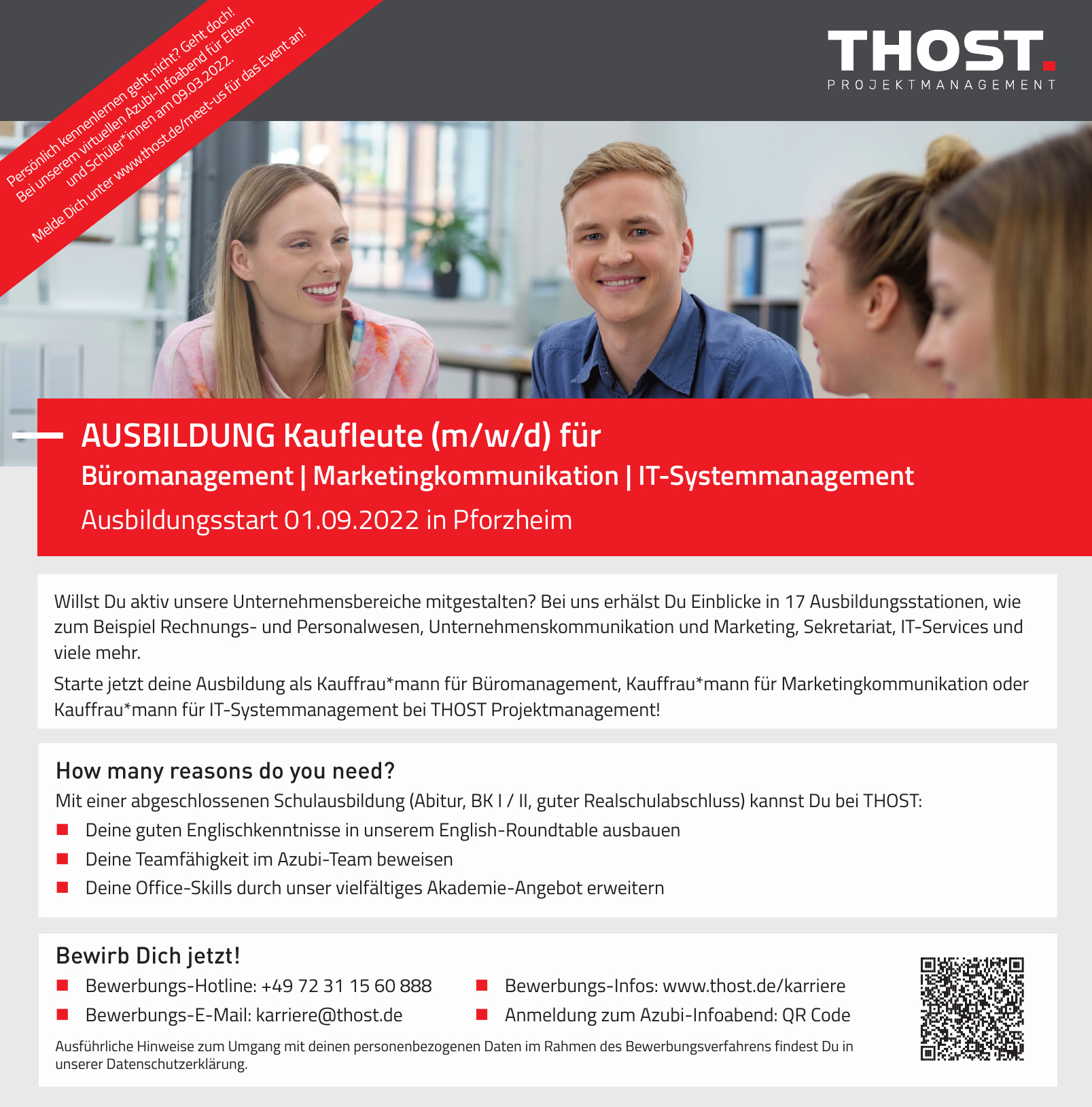 Wie lautet deine exakte Berufsbezeichnung?Kauffrau für BüromanagementWarum hast du dich dafür entschieden?Ich habe mich für eine Ausbildung in diesem Beruf entschieden, da es täglich neue, abwechslungsreiche Aufgaben gibt, wodurch es nie langweilig wird. In meinem Betrieb, der THOST Projektmanagement GmbH, werden viele verschiedene Abteilungen durchlaufen und somit unterschiedliche Einsatzmöglichkeiten von Kaufleuten für Büromanagement kennengelernt.Wie stehen damit die Zukunftschancen?Kaufleute für Büromanagement werden in allen Branchen gebraucht, weswegen auf dem Arbeitsmarkt Stellen in vielen verschiedenen Unternehmen zu finden sind – die Zukunftschancen stehen also sehr gut.