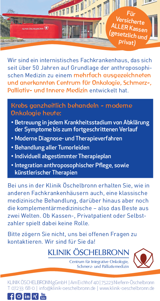 Darüber hinaus spielen Ernährung, Bewegung, psychologische Begleitung und und nicht zuletzt Achtsamkeit eine wichtige Rolle. Sie stärken Ressourcen und helfen, die körperlichen und seelischen Belastungen einer Krebserkrankung besser zu bewältigen. pm