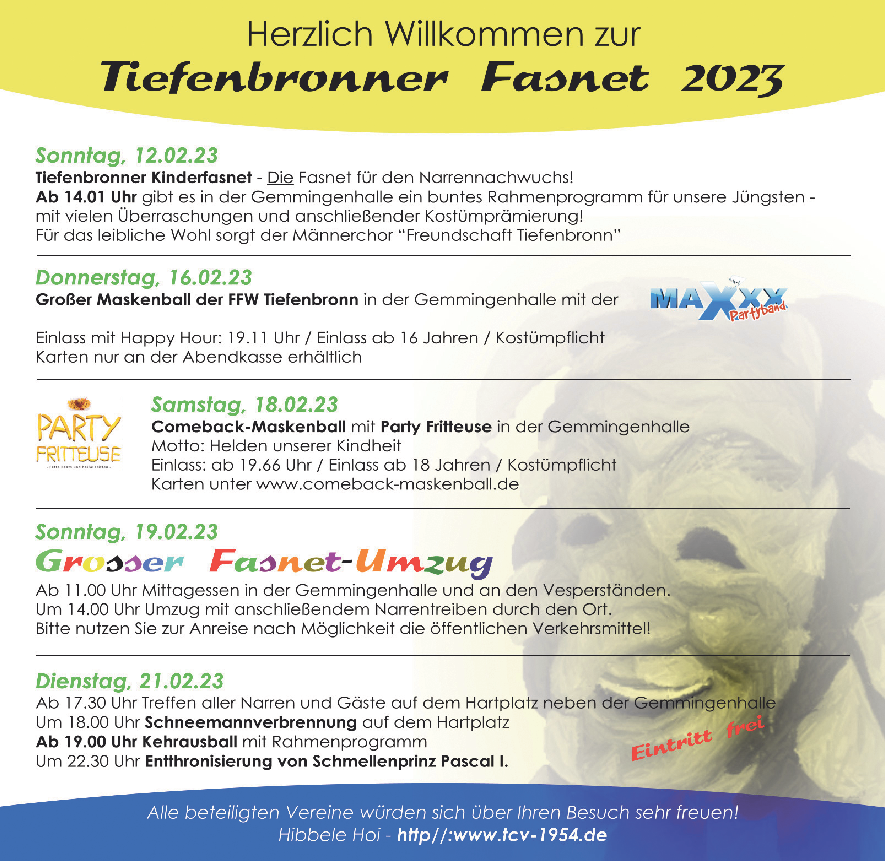 Am Freitag, 17. Februar besuchen die Narren, angeführt von Schmellenprinz Pascal I., früh morgens die Kinder der Grundschule und des Kindergartens sowie die Bewohner der Seniorenheime Tiefenbronn und Heimsheim. Der große Maskenball des Tiefenbronner Tennisclubs und des Fußballvereins steigt am Samstag, 18. Februar ab 19.66 Uhr unter dem Motto „Helden unserer Kindheit".