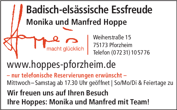 Beim Internetportal „Tripadvisor“ belegt das renommierte Restaurant Hoppe’s in Pforzheim unangefochten den Platz Eins. In der Tat kein Glücksfall, sondern das Resultat eines unternehmungsfreudigen Lebens in der gehobenen Gastronomie. Davon sind sie geprägt – das Ehepaar Manfred und Monika Hoppe. Seit vier Jahrzehnten sind sie in der Gastroszene unterwegs, zuerst fünf Jahre mit einem Grunbacher Landgasthof, dann in der Goldstadt. „Die Menschen kommen einfach gerne zu uns.“Gemütlich ist hier angesagt, charmant-lebendig und richtig sympathisch ist die Ansprache an die Gäste! Wer’s elsässisch-badisch mag, darf sich etwa auf „Coq au vin à la chef“ oder „Flusszander mit Rieslingsauce“ freuen, so empfiehlt der Guide Michelin. An der Weiherstraße kommt in der Tat eine frische, ambitionierte Küche „a la minute“ auf den Tisch. Und das in einem heimeligen Ambiente mit viel Liebe zum Detail gestaltet. Was den beiden besonders am Herzen liegt: Die ganz eigenen Vorlieben der Besucher. „Wir haben viele Stammgäste, jetzt kommen schon die Kinder und Kindeskinder“, darauf kann Monika Hoppe zu Recht stolz sein. Denn Gastfreundschaft, Liebe und Leidenschaft zum Essen sowie frische Zutaten sind bei Hoppe’s nicht wegzudenken. Das schätzen die Gäste hier. So sieht eben gelebte Leidenschaft für den Beruf in einem in allen Belangen angenehmen Restaurant aus. kin