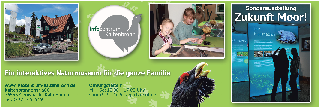 Das Infozentrum in Kaltenbronn ist ein Natur-Museum, Veranstaltungshaus und Informationsportal für alles rund um die Natur auf dem Kaltenbronn. Hier heißt es anfassen und aktiv werden! Kommen, sehen, staunen und verstehen! In der interaktiven Dauerausstellung auf zwei Stockwerken können Flora und Fauna, Landschaft und Geschichte entdeckt werden. pm