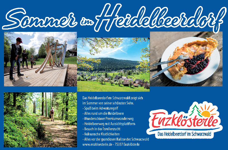 Eingebettet zwischen saftigen Wiesen, grünen Tannenwäldern, direkt am Rande des größten Hochmoor-Naturschutzgebietes Deutschlands, liegt das Heidelbeerdörfchen Enzklösterle. Die ruhige Lage inmitten des nördlichen Schwarzwaldes lädt zu einer entspannten Auszeit und bietet den idealen Rahmen für ein Dorf-Urlaubs-Erlebnis. Der idyllische Luftkurort bietet jede Menge Möglichkeiten für einen ereignisreichen oder entspannten Urlaub. Ob Minigolf im Adventure Golfpark, Wanderungen über den Genießerpfad Heidelbeerweg oder über den Urwalderlebnispfad Bärlochkar, Höhenerlebnis im Waldklettergarten oder ein Besuch des Schaufloßes im Kurpark. Das Thema Heidelbeere ist ganzjährig präsent, nicht nur weil der zwölf Kilometer lange, premiumzertifizierte Heidelbeerweg rund um das Dorf führt. pm