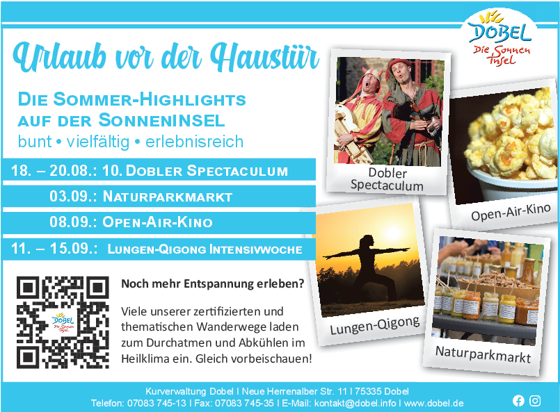 Ob eine Zeitreise ins Mittelalter am Dobler Spectaculum, verschiedene Vereinsveranstaltungen wie das Dorfwiesenfeschd oder das Sportfreunde Jubiläumsfest oder ruhige Momente inmitten der Natur zum Genießen, Erleben und Verweilen. Vom Zuhören des Rauschens der Eyach, dem Genießen der Aussicht vom ehemaligen Wasserturm, der Wanderung durch grüne Wälder und Wiesen, dem Picknick im Kurpark oder Flammkuchen-Essen in der Eyachmühle - Dobel ist etwas für alle Generationen.