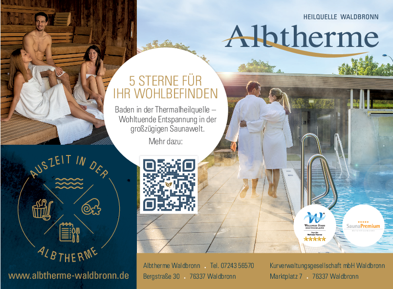 Summertime in der Albtherme, das ist Auszeit auf schattigen Liegen unter alten Bäumen oder unterm Sonnenschirm, ohne Hektik, ohne Lärm. Dafür stehen auch fünf ausgezeichnete Wellness-Sterne. Wunderbare Wohlfühl-Angebote wie z. B. der „Albtherme-Relax“ Tag oder das Arrangement „Zeit zu zweit“ sind auch als exklusive Geschenkgutscheine erhältlich – es ist so einfach, Zeit für Gesundheit und Wohlbefinden zu verschenken!