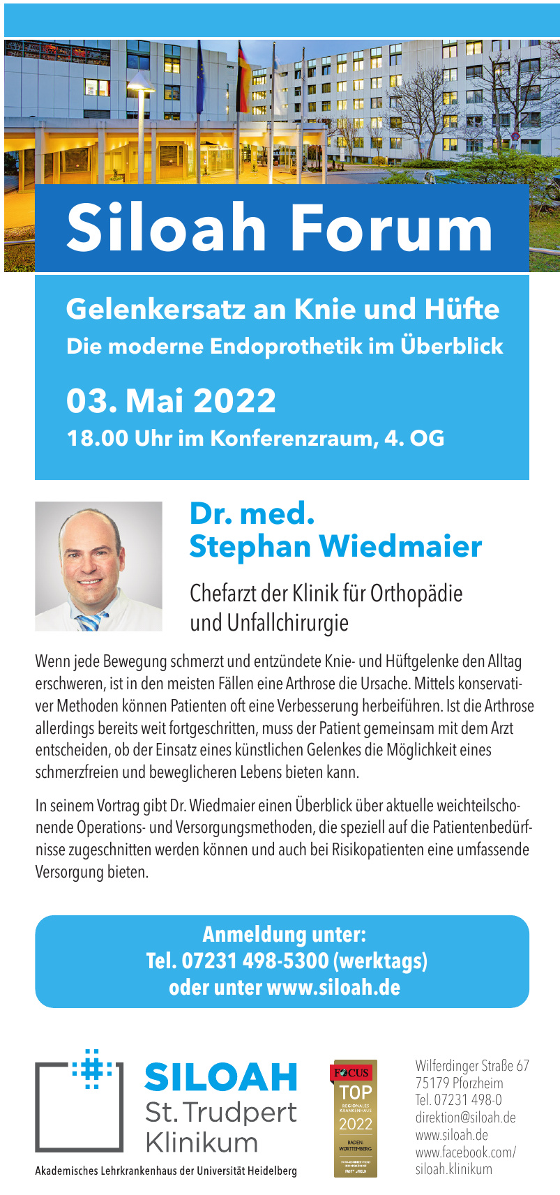 Ein künstliches Gelenk, ob an Knie oder Hüfte, kann mit bewährten wie auch minimal-invasiven Methoden eingesetzt werden. Chirurgen geben den modernen, minimal-invasiven Eingriffen in der Regel den Vorzug. In der Endoprothetik profitieren Patientinnen und Patienten aus mehreren Gründen von dieser OP-Methode, wie Dr. med. Stephan Wiedmaier, Leiter des Endoprothetikzentrums im Siloah St. Trudpert Klinikum und Chefarzt der Klinik für Orthopädie und Unfallchirurgie, im Interview erklärt.