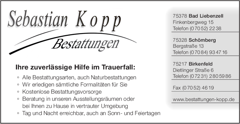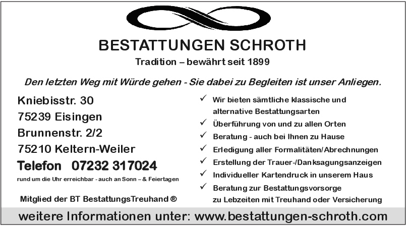 Ein Helfer in schweren Zeiten, das sind wir. Bei der Beratung und Begleitung von Vorsorgenden und Trauernden ist uns besonders wichtig, dass sich jeder bei uns im Pforzheimer Bestattungshaus gut aufgehoben fühlt. Empathie, Verständnis, ein offenes Ohr sowie die Berücksichtigung der Wünsche sind für mich Grundvoraussetzung meiner Arbeit.