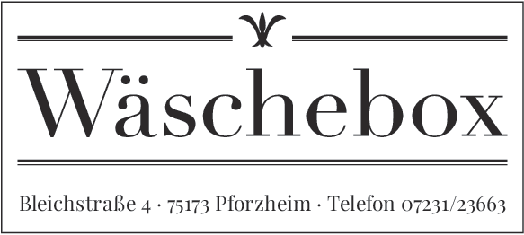 Sie ist eine der ersten Adressen für Dessous und Bademoden in der Region: die Wäschebox an der Bleichstraße 4. Und wie eh und je erstrahlt das renommierte Fachgeschäft in überaus attraktiven Gestaltung – die anspruchsvolle Kundin ist es von Maité Frey nicht anders gewohnt. Genannt sei hier nur die von drei Pforzheimer Kreativen entworfene und gebaute Ladentheke, die ihresgleichen sucht.