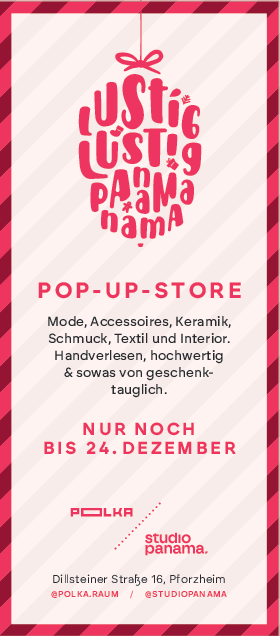 Neben ihren eigenen Werken präsentiert sie im angrenzenden „Polka – Raum“ unter dem Namen „Lustig lustig Panamanama“ bis zum 24. Dezember viele hochwertige Designprodukte und Geschenkartikel. Schönes findet man dort von Glasbläsern, Keramikproduzenten, einer Kosmetikmanufaktur, aber auch Brände und Likör einer renommierten Brennerei. pm