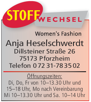 Style mit Statement - so könnte man Anja Heselschwerdts Philosophie auf den Punkt bringen. Mode mit klarem Statement, die gibt es in ihrem Stoffwechsel“ an der Dillsteiner Straße schon seit 21 Jahren. In ihrer kleinen, feinen Boutique auf Pforzheims Flaniermeile präsentiert sie Damenmode mit dem gewissen Etwas für jedes Alter. Von klassisch-feminin über sportlich-elegant bis hin zu lässig und gerne auch ein bisschen flippig. Anjas Spezialität: Sie zaubert immer wieder ungewöhnliche Kombinationen und komplette Outfits, mit denen sie ihre Kundinnen überrascht und begeistert. Und spannt den Bogen von schnörkellos-klaren Designs bis zum verspielten Ibiza-Look mit Vintage-Anmutung. Dabei legt sie größten Wert auf hochwertige Qualität und nachhaltige, ethische Herstellungsprozesse.