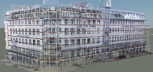 Das so erbaute Gerüst ermöglicht den Handwerken die sichere Modernisierung des Verlagshauses und wird die Sicht bald freigeben, wenn die neu gestaltete Fassade enthüllt wird. Lucas Wolf leitete den Scan und die Planung des Gerüsts, erstellte die erforderlichen CAD-Rüstpläne, Materiallisten und 3D-Modellansichten, um die Montage vor Ort zu erleichtern.