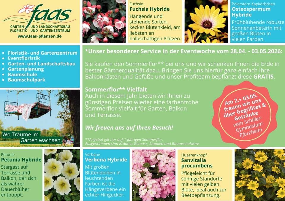 Ein besonderes Augenmerk legt Faas in dieser sommerlichen Eventwoche auf einen praktischen Service: Kundinnen und Kunden, die einjährigen Sommerflor vor Ort kaufen, können ihre Balkonkästen oder Pflanzgefäße einfach mitbringen. Das kompetente Team von Faas übernimmt dann die Bepflanzung kostenlos für Sie. Der Sommerflor wird natürlich in Erde mit bester Gärtnerqualität gepflanzt, welche Sie gratis dazu erhalten. Wichtig: Das Angebot gilt ausschließlich für einjährigen Sommerflor; Kräuter, Gemüse, Stauden und Baumschulware sind ausgenommen.